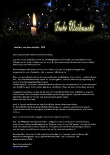 .Dezember 25Grussworte des Kreisvorsitzenden zum Jahresende.24.11.202564 Starts am kommenden Wochenende bei der Kreismeisterschaft 2026Weiter gehts es am Wochenende mit den Diszplinen „UnterhebelRepetierer“und „Zimmerstutzen. mit 64 Start‘s in Langenfeld und Haan wird es zu interessanten Wettkämpfen kommen.Zur Halbzeit sind dann am 13/14. Dezember noch die SpoPi-Schützen und Schützinnen am Start.Hier gibt es weitere Info‘s zur KM‘26RM--------------------------------------------------------------------------.08.11.2025Weiter geht‘s mit den Kreismeisterschaften 2026Den Auftakt an diesem Wochenende machten die Schützen und Schützinnenmit dem Luftgewehr in der Disziplin 10m Freihand.Mit guten Ergebnissen und einem Kreisrekord ging dieses Tag zu Ende.Am Sonntag gab es viele gute Ergebnisse und 4 Kreisrekorde.Herzlichen GlückwunschHier geht es zu den ErgebnissenRM--------------------------------------------------------------------------.02.11.2025Die Kreismeisterschaften 2026 haben begonnenMit Pistolenwettbewerben haben heute die KM‘26 begonnen. Wir werden,wie in den vergangenen Jahren, versuchen die aktuellen Ergebnisse soschnelle wie möglich auf unsere Kreis-Homepage zu veröffentlichen.Wir wünschen allen Sportler*innen einen fairen und angenehmen Verlauf der Meisterschaften.Am ersten Tag der Meisterschaft wurden 4 Kreisrekorde erzielt.Weiter ging es am 2.11. mit der freien Pistole.Hier geht es zu den Ergebnissen….RM--------------------------------------------------------------------------.29.10.2025WICHTIGE TERMINE am WochenendeDie Kreismeisterschaften 2026 beginnen am Samstag, 1.11.2025, in Trompete und am Sonntag, 2.11 in Balken mit den Kurzwaffen. Viel Erfolg wünschen wir den Sportler*innenEbenfalls findet am Sonntag, 2.11.25, ab 15,00 Uhr unser diesjähriges Kreisfest in Langenfeld statt.Höhepunkte sind das Kreiskönigs/Prinzenschiessen mit anschl. Proklamation und die Ehrung der Teilnehmer und Teilnehmerinnen an der DEUTSCHEN MEISTERSCHAFT 2025.Wir freuen uns auf Euren BesuchRM--------------------------------------------------------------------------.24.10.2025Es ist das letzte Wochenende der DEUTSCHEN MEISTERSCHAFT 2025An diesem Wochenende werden in Dortmund die letzten Medaillen bei derDM‘25 in der Disziplin Luftgewehr-Auflage vergeben.Aus unserem Kreis nehmen noch 8 Sportlerinnen und Sportler, aus demVereinen Höhscheid, Langenfeld, Haan und Balken teil. Wir hoffen auf gute Ergebnisse und drücken allen Schützinnen und Schützendie Daumen.Hier gibt es die Ergebnisse die ersten Ergebnisse der 8 Sportler*innen.Alle Ergebnisse sind da. Hier ist die Ergebnisliste aller Sportler und Sportlerinnen die an der DEUTSCHEN MEISTERSCHAFT 2025 teilgenommen haben….Ulrike Schönthal schoß neuen Kreisrekord.Wir gratulieren und werden diese Schützen*innen auf dem Kreisfest (2.11.25) ehren.RM--------------------------------------------------------------------------.05.10.2025DM in Hannover mit den letzten Wettkämpfen und zweiMeistertiteln abgeschlossen. Auch am letzten Tag der Wettkämpfe konnten unsere Sportlerinnen undSportler in Hannover überzeugen. Super Ergebnisse in den Auflage-DisziplinenKK-50m und LP wurden erzielt.Andrea Hölterhoff (Balken) holte sich zum Abschluss der DM in Hannovergleich 2 Meistertitel. In der Disziplin KK-50m-Auflage wurde sie in derSeniorinnen II-Klasse DEUTSCHE MEISTERIN. Zusammen mit ihrenMannschaftskameradinnen - Marion Reimer und Margit Zaß - holte sie sich auch den Meistertitel mit der Mannschaft.Margit Zaß vervollständigte das gute Ergebnis der Balker Schützinnen mit Platz 2 in der Einzelwertung. Allen „HERZLICHEN GLÜCKWUNSCH“Hier sind die ErgebnisseAm 25.+26. Oktober wird die DEUTSCHE MEISTERSCHAFT 2025 in Dortmund mit der Disziplin Luftgewehr-Auflage beendet. Dort sind dann nochmals 8 Schützinnen und Schützen unseres Kreises am Start.Wir drücken die „Daumen“.RM--------------------------------------------------------------------------.30.09.2025Kreiskönigin mit gutem Ergebnis beim Landeskönigschiessen 2025Am letzten Wochenende fand das Landeskönigs/Prinzenschießen 2025 statt.Die Majestäten der Bezirke und Kreise des RSB waren zu dieser Veranstaltungeingeladen. Die Königin unseres Kreises, Ingetraut Forte (Haaner SV.) war auch am Start.Ingetraut konnte mit einem Teiler von 26,9 unter 34 Teilnehmern*innen den12. Platz belegen.Bei dem Landesprinzenschießen wir auch eine Schützin unseres Kreises am Start.Lilly Kiesewalter (SV. Langenfeld) belegt den 6. Platz mit einem Teiler von 66.9.Herzlichen Glückwunsch Ingetraut und Lilly.Am 2. November sucht die Kreis den Nachfolger von Ingetraut. Bitte vormerken. Die Einladungen sind bei den Vereinen.Gleichzeitig fand auch das Schießen um den HOHGREFE-Pokal statt. Hier siegte unser Bezirk 05. In dieser Mannschaft waren auch Schützinnen unseres Kreises (Andrea Hölthoff und Margit Zaß). Auch hier herzlichen Glückwunsch der gesammten Mannschaft.Hier ein paar BilderRM--------------------------------------------------------------------------,29.09.2025Bundesligawettkampf im Sportschiessen in SolingenAm 11.+12. Oktober führen die Sportschützen*innen der Ohligser SG ihren Heimkampf der Bundesliga NORD in Solingen durch. Insgesamt finden an diesem Wochenende in der Sporthalle der August-Dicke-Schule, Solingen, 6 Wettkämpfe statt. Wir empfehlen diese Veranstaltung zu besuchen um die OhligserMannschaft zu unterstützen. Für weitere Infos KLICK auf das PlakatRM--------------------------------------------------------------------------.20.09.2025Acht Sportschützen unseres Kreises in Hannover am StartIn Hannover ging es für 8 Sportschützen aus den Vereinen SV. Langenfeld undSV. Trompete um DEUTSCHE MEISTER-TITEL in der Disziplin KK-Unterhebel-repetierer.Trotz guter Ergebnisse reichte es diesmal nicht für einen Platz auf dem „Treppchen“. Das bester Ergebnis erzielte unser Fachwart Pistole, Dirk Korthauer (SV. Langenfeld), mit 347 Ringen und Platz 13.Herzlichen Glü